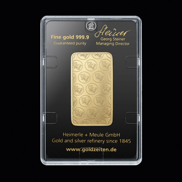 1845 in Pforzheim gegründet ist Heimerle + Meule die älteste Gold- und Silberscheideanstalt Deutschlands. Zu den Produkten zählen Schmuck und Elektronikkomponenten, aber auch Anlagebarren mit hoher Qualität und Reinheit. Der 50 g Goldbarren, Heimerle + Meule (geprägt) hat ein Feingewicht von 50 g und eine Feinheit von 999,9. Das LBMA-Siegel versichert eine hohe Qualität des Goldes.